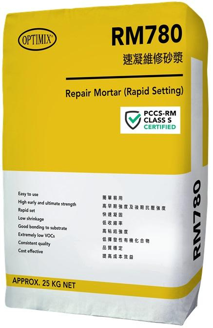 OPTIMIX RM780 REPAIR MORTAR (RAPID SETTING) is a high quality pre-mixed, shrinkage-compensated fast-setting mortar. It has an extended working time yet ultra-rapid strength gain for speedy repair, reinstatement or renovation purposes. RM780 is certified as PCCS-RM Class S compliant.