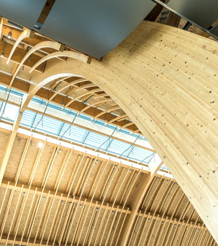 Glued laminated timber, or glulam, is the beating heart of timber engineering. Several layers of spruce wood are glued together in the direction of the grain and processed into customised glulam elements. Our glued laminated timber offers excellent statics qualities. It is light-weight and retains its shape. Using glulam allows for large-range constructions without thermal bridges, offers excellent resistance in chemically aggressive environments and offers a number of other, lesser known benefits: The material offers a naturally high resistance to fire. The charred layer on the outside of the material caused by fire slows down or even prevents more substantial fire damage to the carrier material. As a result, timber structures never fail spontaneously. Burning speed and retention of load-bearing capacity can be calculated.